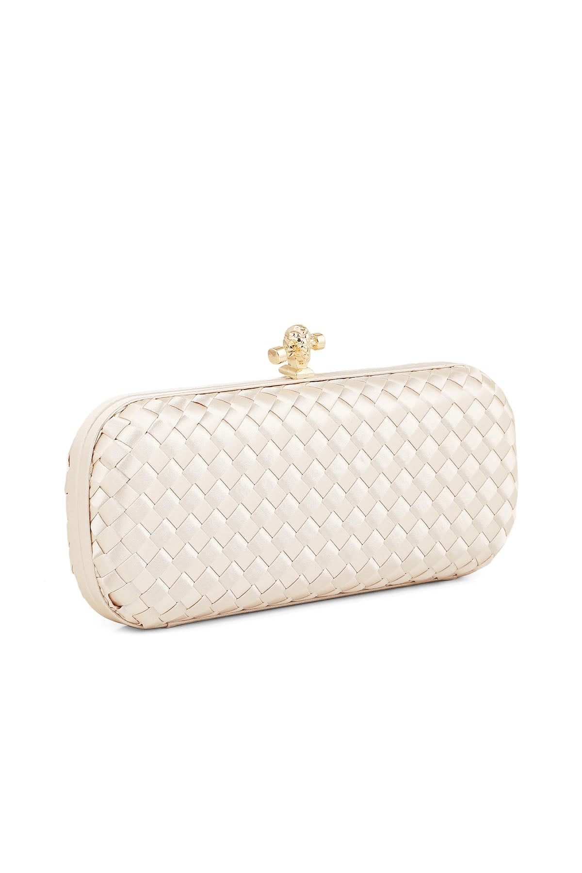 This is a golden clutch with a metallic finish. The purse does not have any straps or handles. The bag can be used as a stylish accessory for a formal occasion.