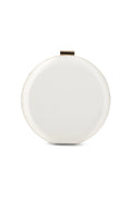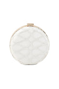 This white colored clutch is made with a metallic frame that is shaped to a fancy oval, has spacious compartment inside and then finished with a clasp lock at top.